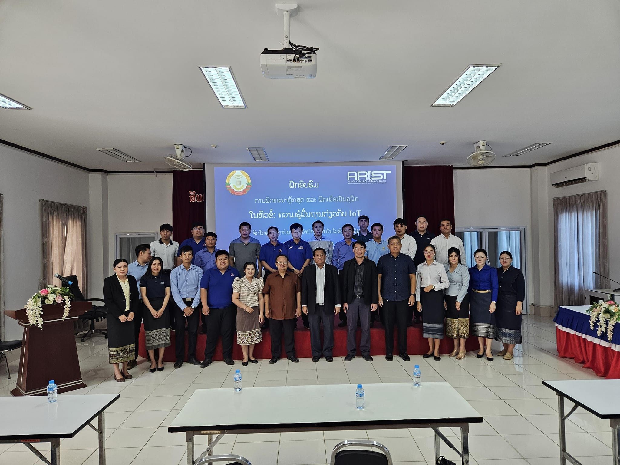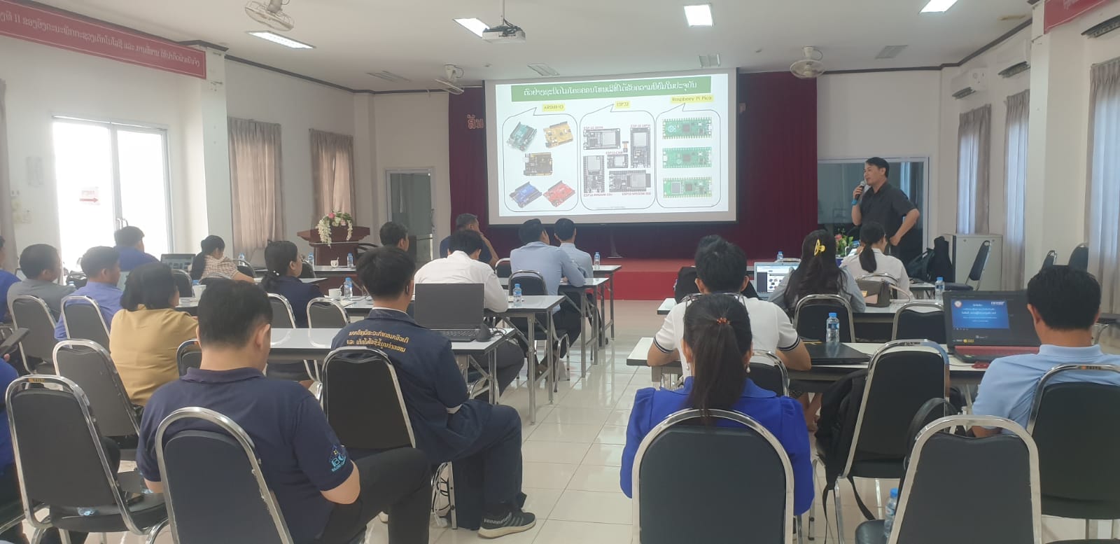 ໃນລະຫວ່າງວັນທີ 20-22 ພະຈິກ 2024 ສຕອ ໄດ້ຈັດຝຶກອົບຮົມການພັດທະນາຫຼັກສູດ ແລະ ຝຶກເພື່ອເປັນຄູຝຶກ ໃນຫົວຂໍ້: ຄວາມຮູ້ຟື້ນຖານ ກ່ຽວກັບ IOT ຢູ່ທີ: ຫ້ອງປະຊຸມສະຖາບັນ ຕສ ຕຶກ F (ເຂດຫຼັກ3), ໂດຍໃຫ້ກຽດເປັນປະທານເປີດ ທ່ານ ປະລິຕະ ແສງຈັນທຣ໌, ຮັກສາການຫົວຫນ້າສະຖາບັນ ຕອ (ເຊິ່ງມີຜູ້ເຂົ້າຮ່ວມຝຶກອົບຮົມທັງໜົດຫຼາຍກວ່າ 50 ທ່ານ).